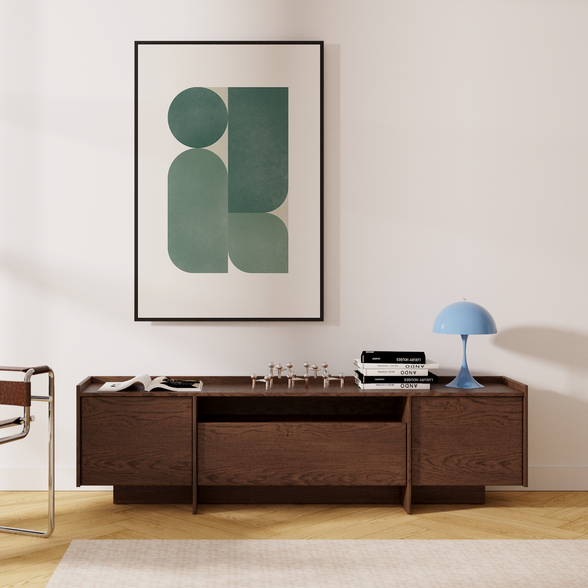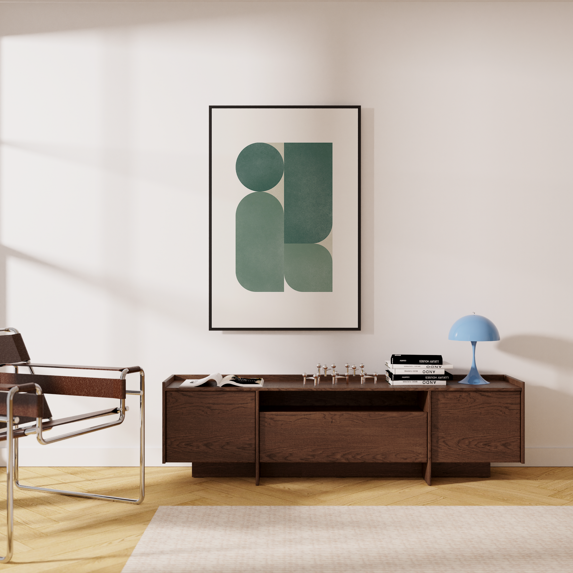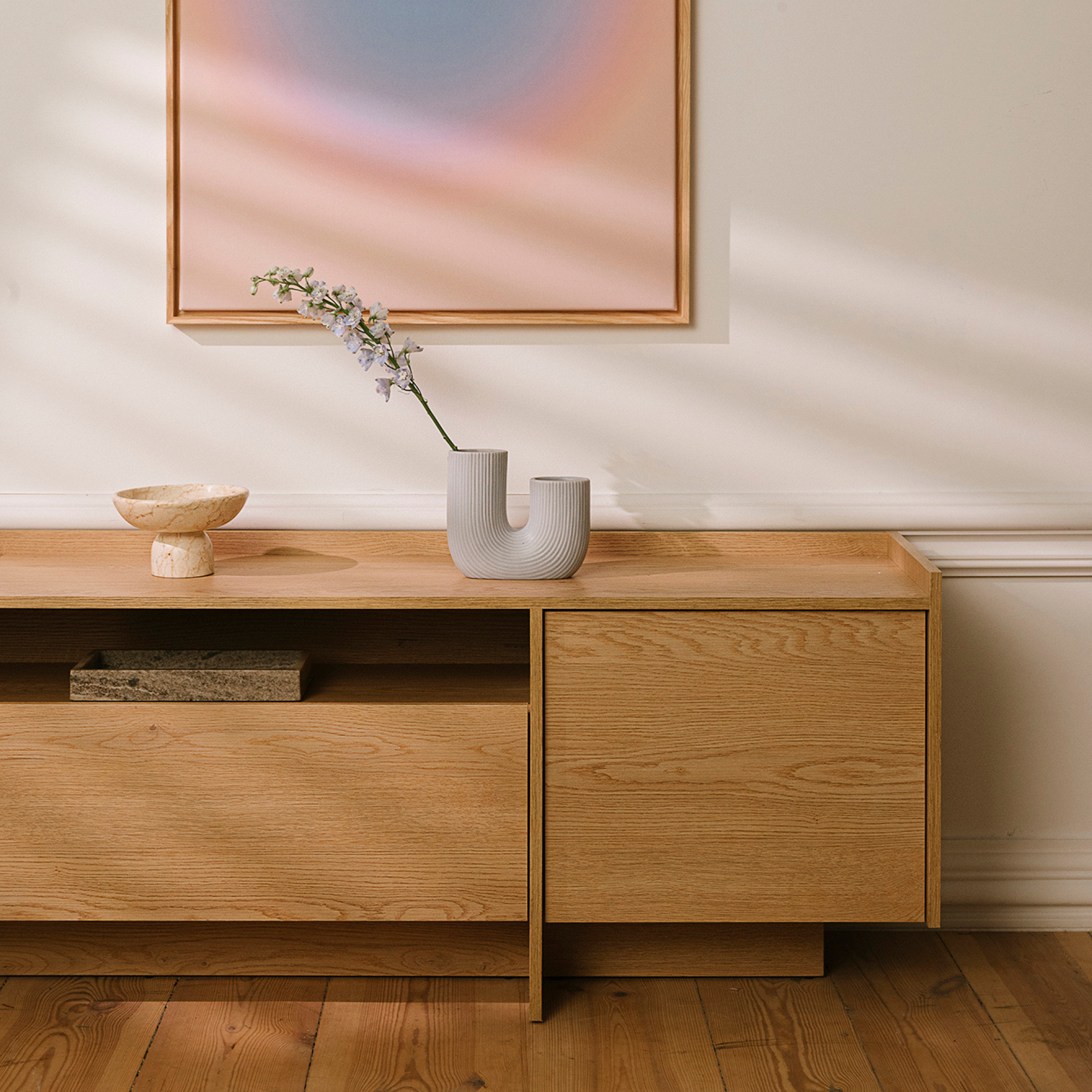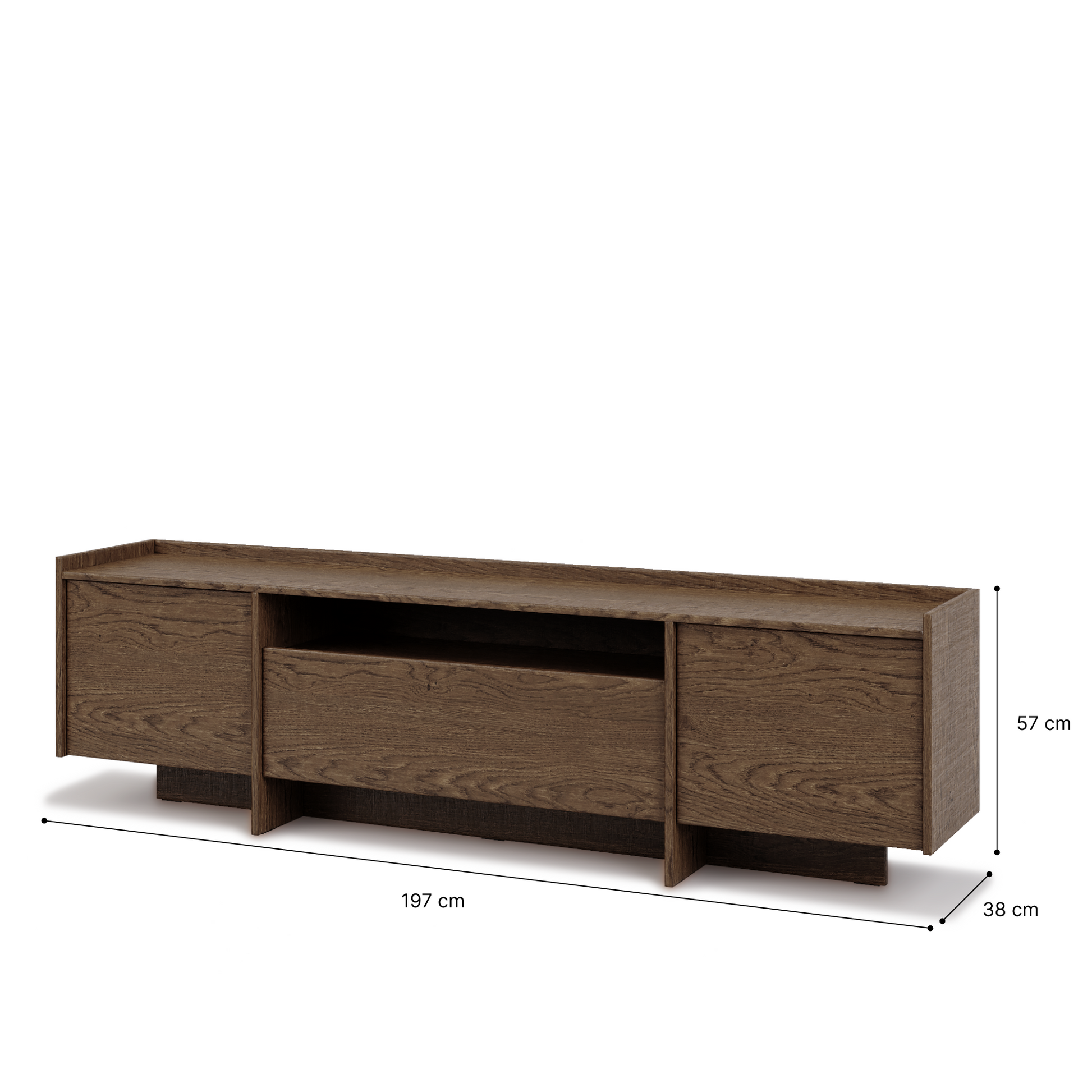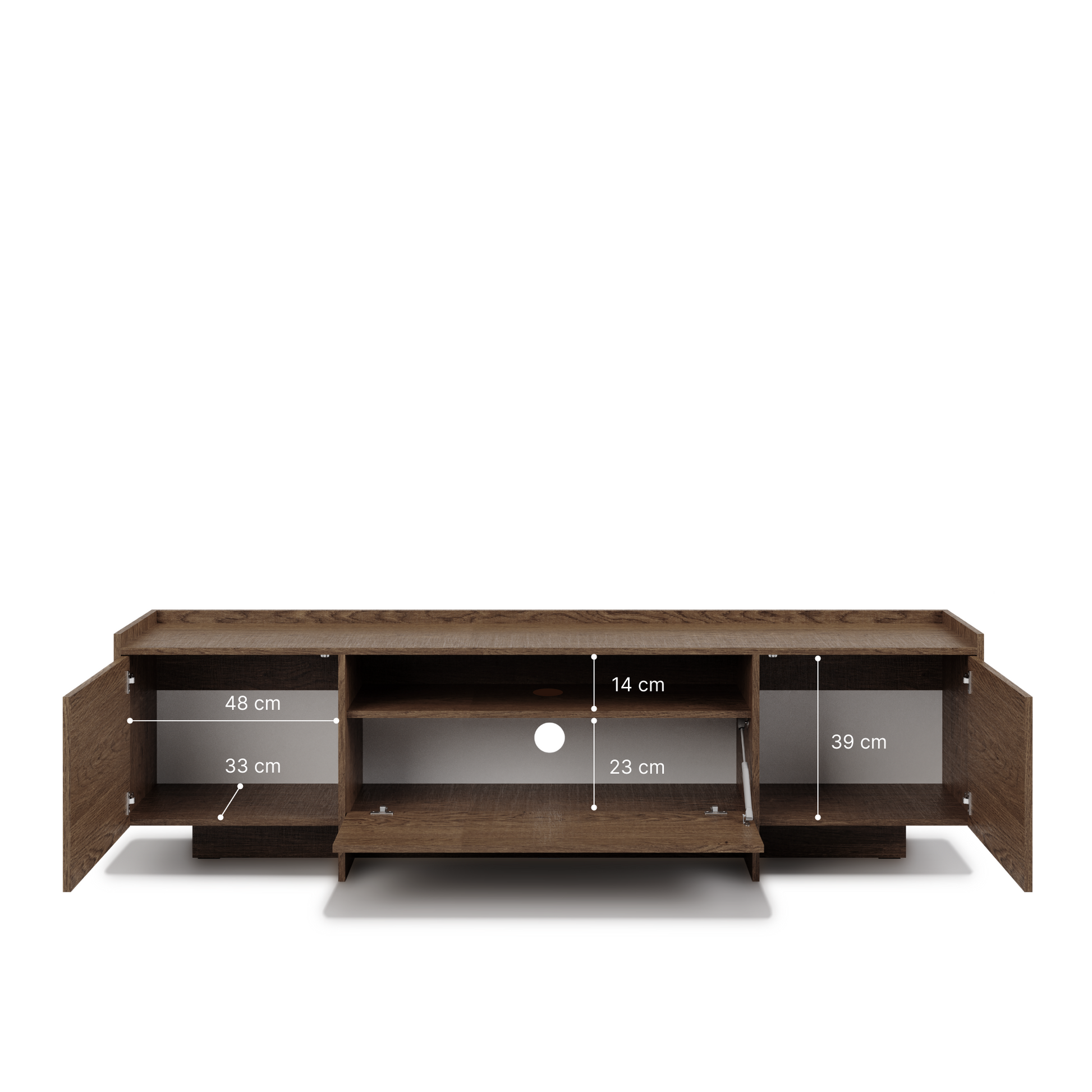 The Japandi cabinet is the epitome of modern design that will fit perfectly into minimalist and modern interiors. Made of durable laminated board, it provides an elegant and clean look. The cabinet has three practical sections: Three cabinets with doors and an open space, ideal for a decoder. Thanks to its solid construction, the cabinet is stable and aesthetically complements any interior.