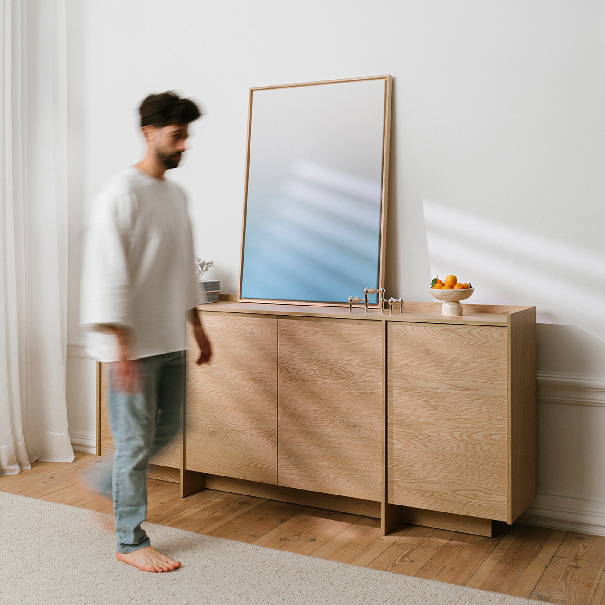 Japandi to kwintesencja nowoczesnego designu, który doskonale wpasuje się w minimalistyczne i nowoczesne wnętrza. Wykonana z trwałej płyty laminowanej, zapewnia elegancki i czysty wygląd. Komoda posiada praktyczne półki, które pomieszczą wiele przedmiotów .Dzięki solidnej konstrukcji, szafka jest stabilna i estetycznie uzupełnia każde wnętrze. Całości dopełnia dębowy dekor, który swoją barwa nawiązuje do naturalnego forniru.