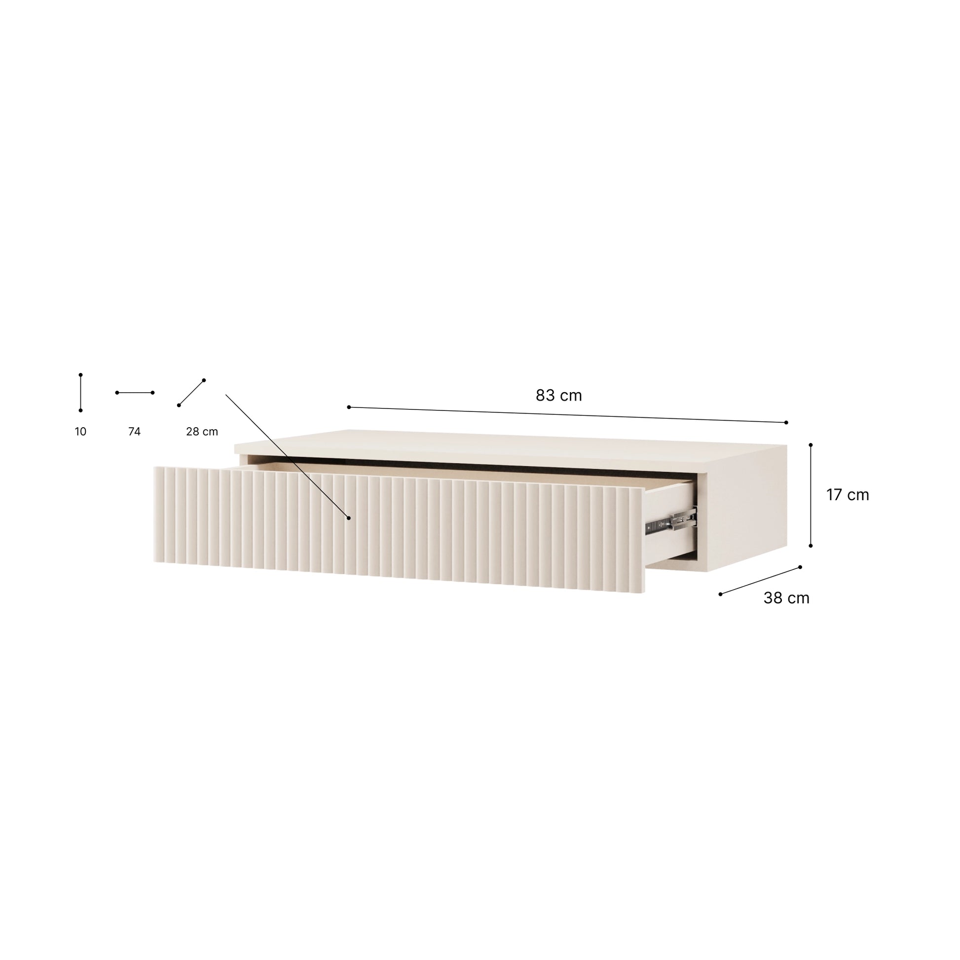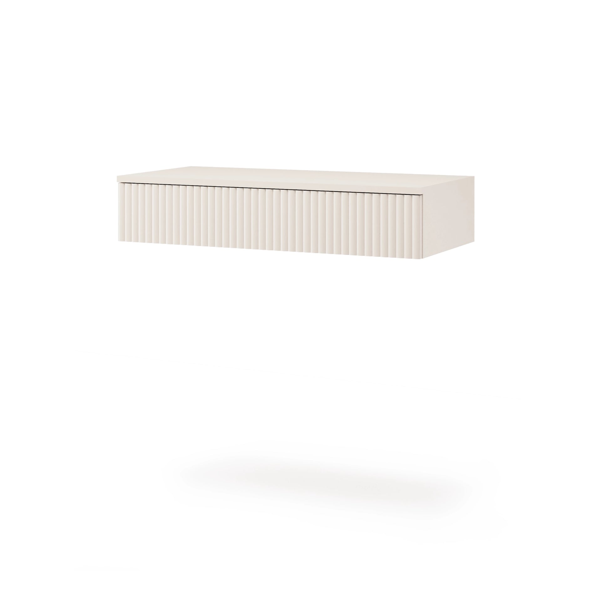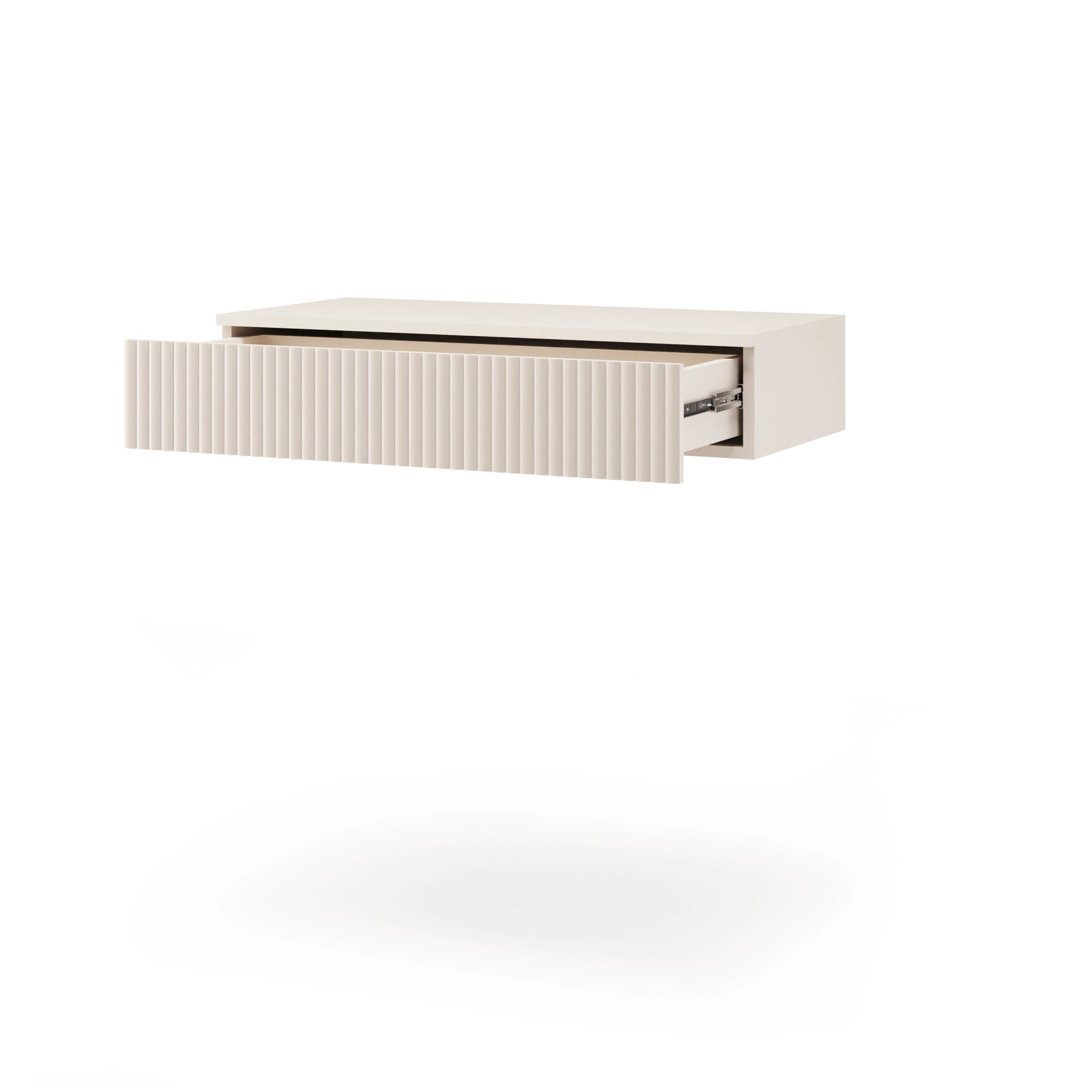 Konsola to kwintesencja nowoczesnego designu, który doskonale wpasuje się w minimalistyczne i nowoczesne wnętrza. Wykonana z trwałej płyty laminowanej w perłowej strukturze, która zapewnia elegancki i czysty wygląd. Szafka posiada pojemną szufladę, która sprawdzą się w przechowywaniu. Dzięki solidnej konstrukcji oraz unikatowej formie, wyróżni wnętrze. Frezowany front MDF dopełnia całości i dodaje charakteru.