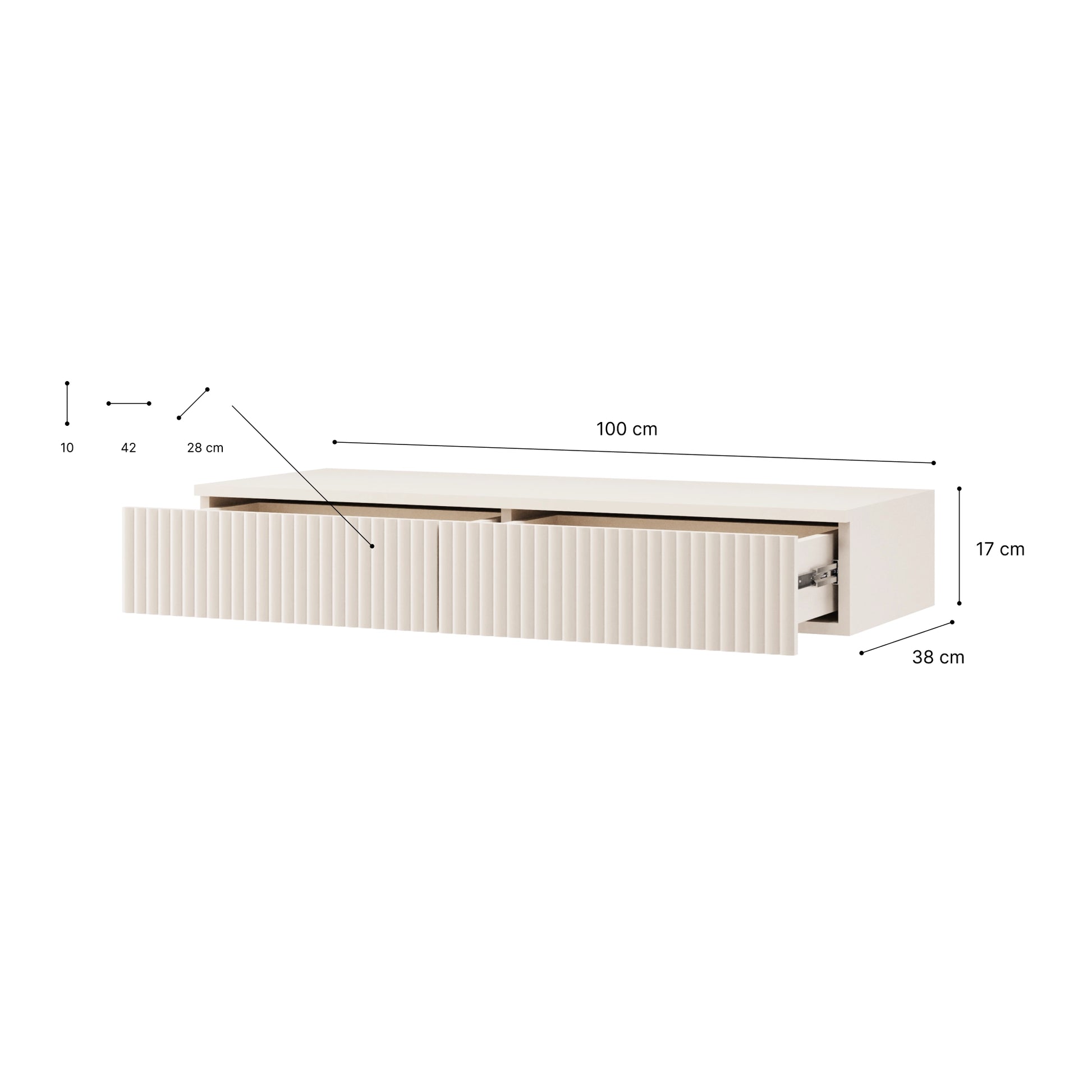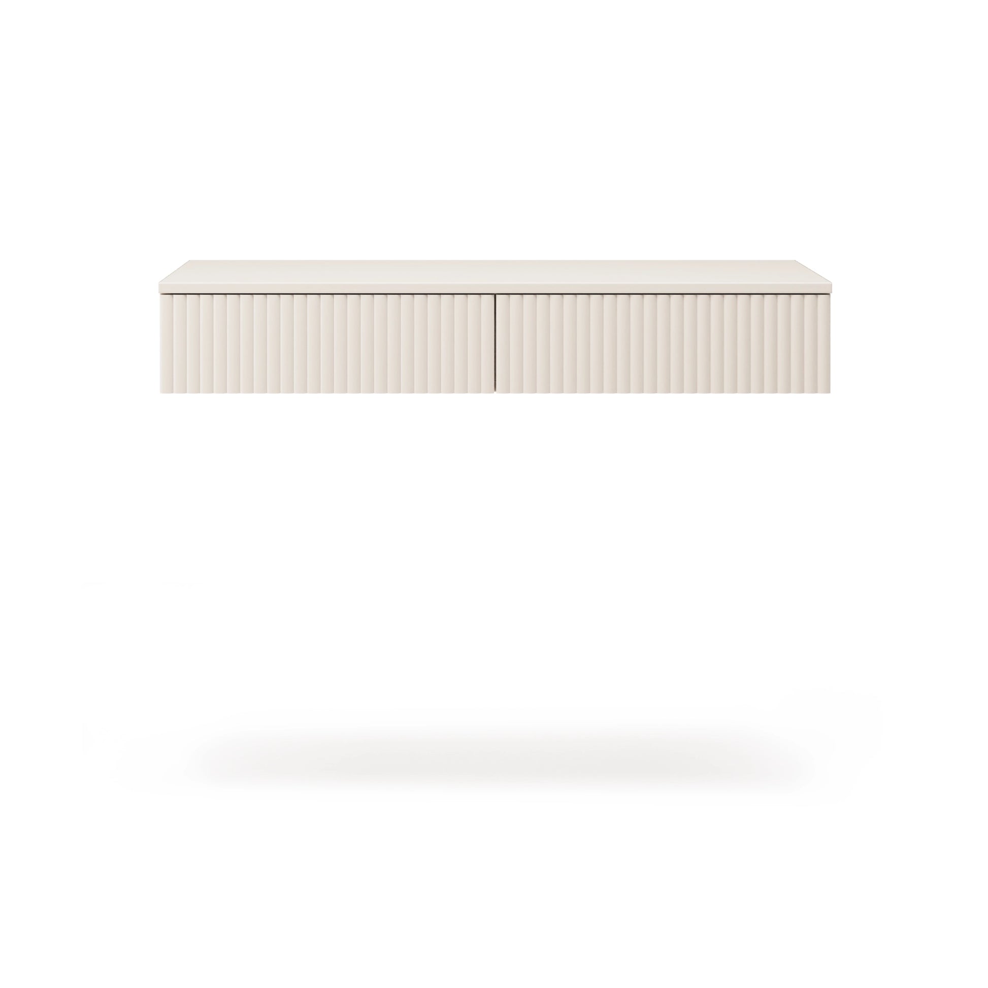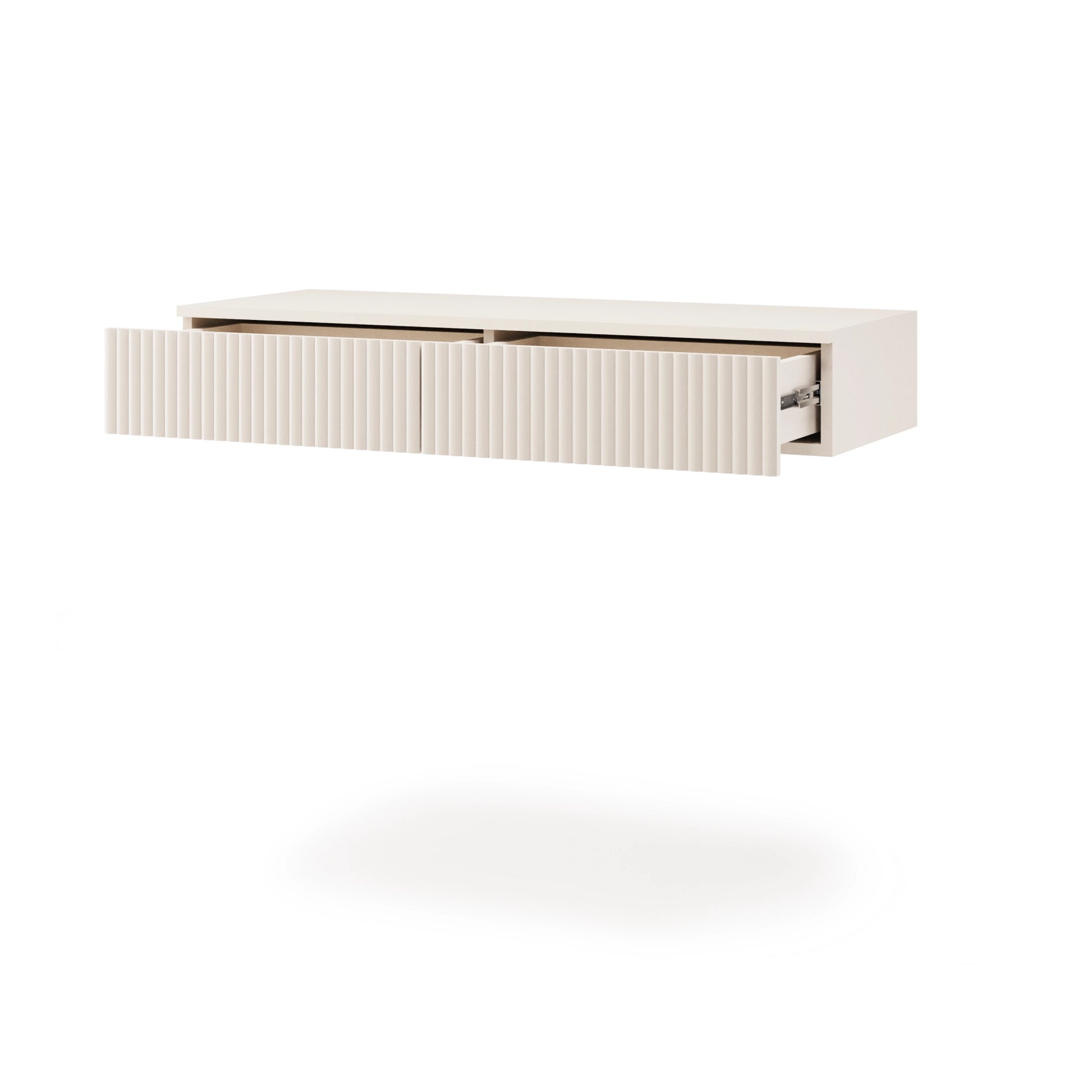 Toaletka podwieszana to kwintesencja nowoczesnego designu, który doskonale wpasuje się w minimalistyczne i nowoczesne wnętrza. Wykonana z trwałej płyty laminowanej w perłowej strukturze, która zapewnia elegancki i czysty wygląd. Szafka posiada pojemne szuflady, która sprawdzą się w przechowywaniu. Dzięki solidnej konstrukcji oraz unikatowej formie, wyróżni wnętrze. Frezowany front MDF dopełnia całości i dodaje charakteru.